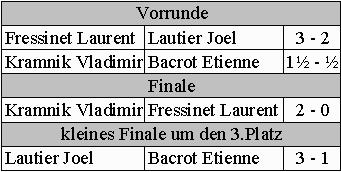 aufeinander, der Modus betrug 6 Partien mit jeweils einer Stunde pro Spieler