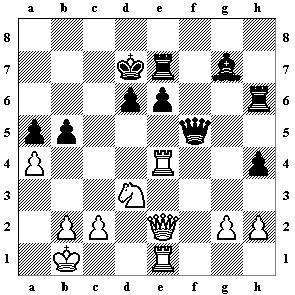 26...Te7 27.Dg4 a5 28.Sf4 Dc4 29.Df3 Tf6 30.Te4 Dc5 31.Tfe1 Kd7 31...e5 32.Dh5+ Tff7 33.Sg6 sieht für Schwarz auch nicht befriedigend aus.
