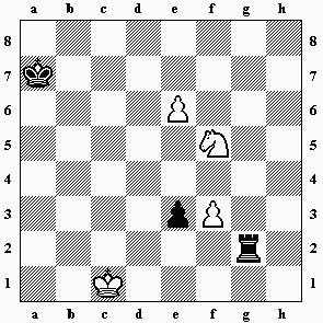 1...e2+ 1...Tg6 verliert: 2.e7 Te6 3.Sd4 e2+ 4.Ke1 Te3 5.Sf5 Te6 (5...Te5
