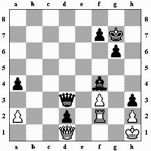 4.f4 De4+ 5.Tf3 Lf2 Elegant! Dd1–f1 ist jetzt unmöglich. 0–1