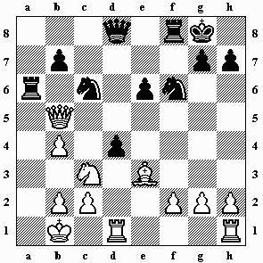 14.0-0 De5 15.Dh5 Df6 16.Sh3 Dg6 17.De2 Ld6 18.Sa3 Dg4