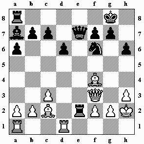 Stande: 22.Sxf6+! gxf6 23.Td3 Se2+ 24.Kb1 Dc8 25.De7 De8 26.Dxf6 Sf4 27.Tfd1!